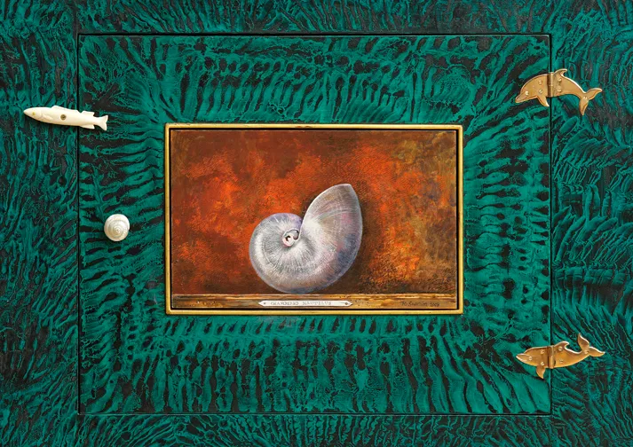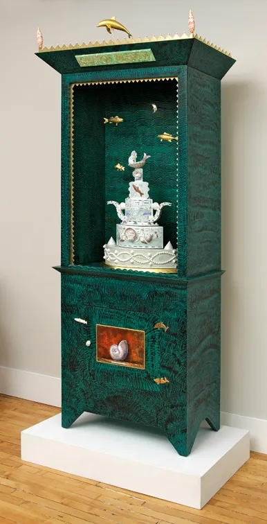 “I was very, very blessed and fortunate, and I would grab him whenever I could—though he was pretty slippery—I’d catch him once in a while. I was usually corralling him into these ideas.” Their ideas culminated in “Aqua Vitae,” “Sea of Plenty,” “Aqua Marina,” “Pearls Collaborative Cabinet”, and other works, each of which consist of a custom cabinet, decorative elements, and egg tempera painting made by Roy and a porcelain centerpiece made by Mara. The cabinets are now in the collections of the Renwick Gallery of the Smithsonian Museum of American Art, the Peabody Essex Museum, the New Britain Museum of American Art, and the Racine Art Museum, respectively.