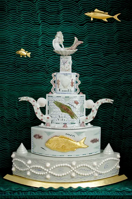 Roy & Mara Superior, “Sea of Plenty”, 2008, 84 x 33 x 16″, high-fired porcelain, ceramic oxides, underglaze, glaze, wood, gold leaf, bone, ink, egg tempera, brass pins, mother of pearl, shells. Peabody Essex Museum.