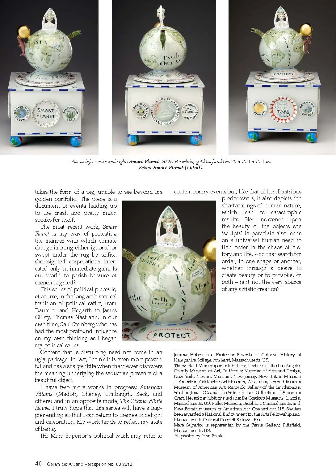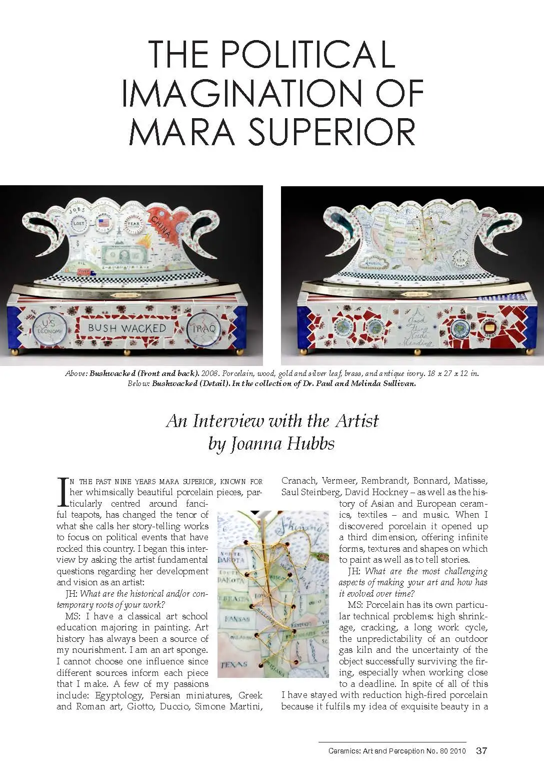 - “The Political Imagination of Mara Superior: An Interview with the Artist”, Hubbs, Joanna. Ceramic Art & Perception Magazine, June 2010.