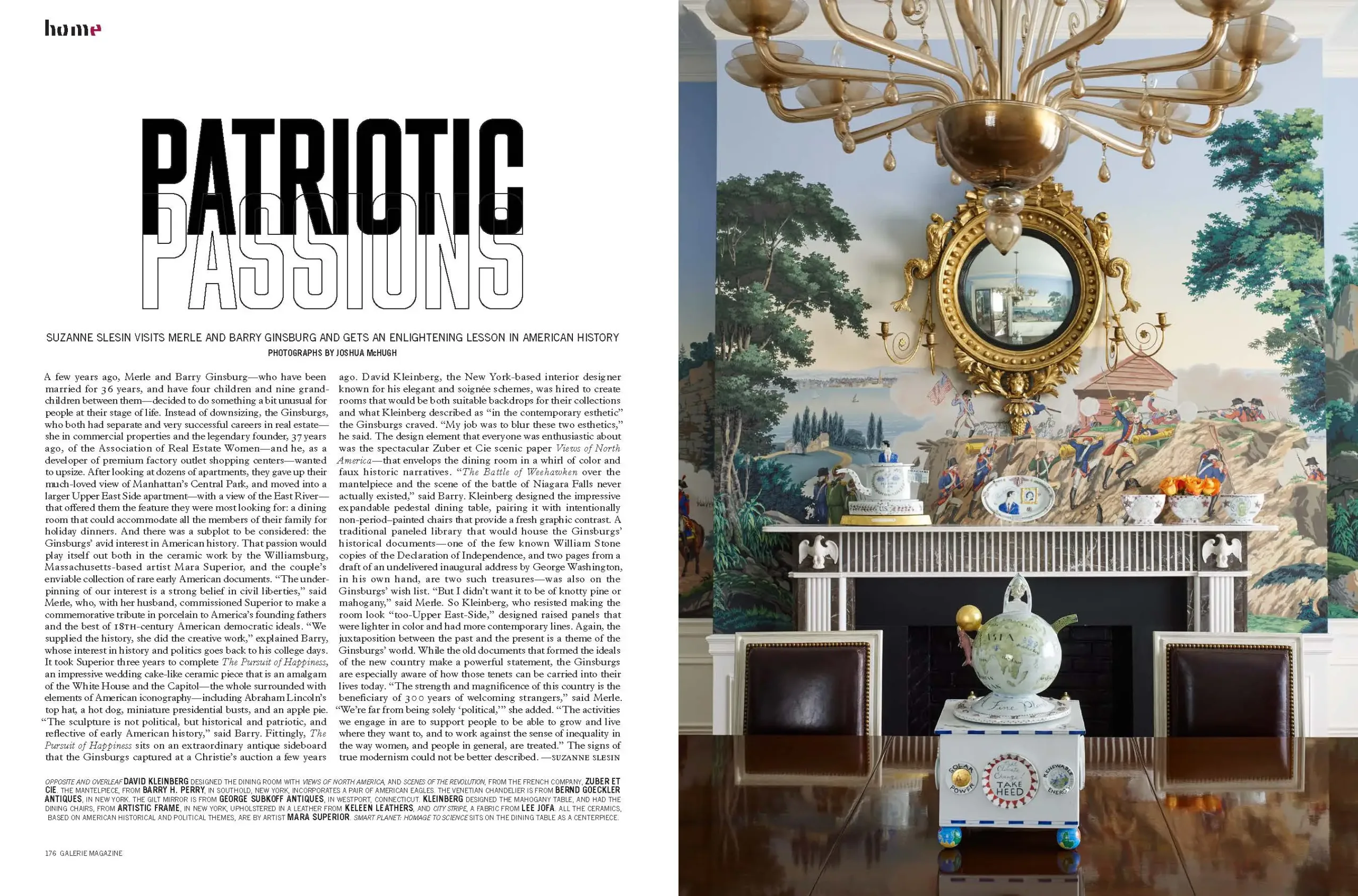 A LEGACY OF FIRSTS: THE EVERSON COLLECTS Mara Superior, “The Pursuit of Happiness”, 2012-2014. “Patriotic Passions” by author Suzy Slesin features Superior’s important commission, “The Pursuit of Happiness,” based on the principles of democracy for a prominent New York private collection. “Mara Superior’s pieces are vessels of memory, powerful forms filled with remembrance...