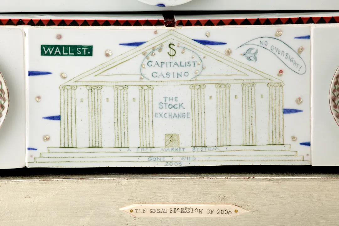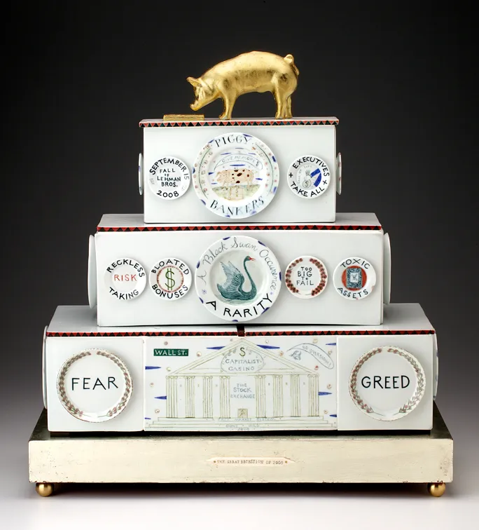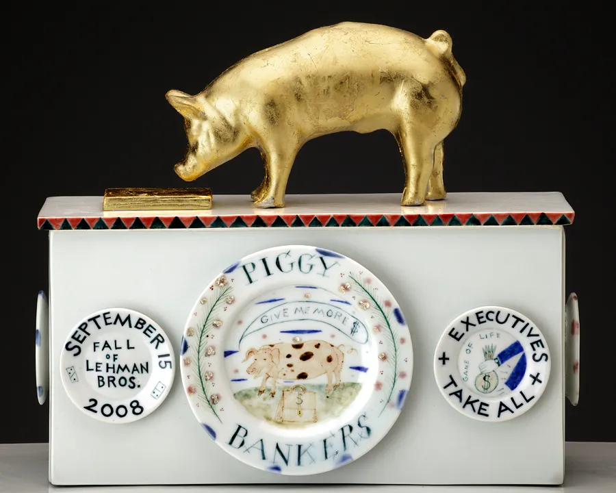Mara Superior, “Piggy Bankers/The Great Recession of 2008″, 2009, 24 x 22 x 9.5”, high-fired porcelain, ceramic oxides, underglaze, glaze, wood, white gold leaf, gold leaf, bone, ink, brass. The Chipstone Foundation.